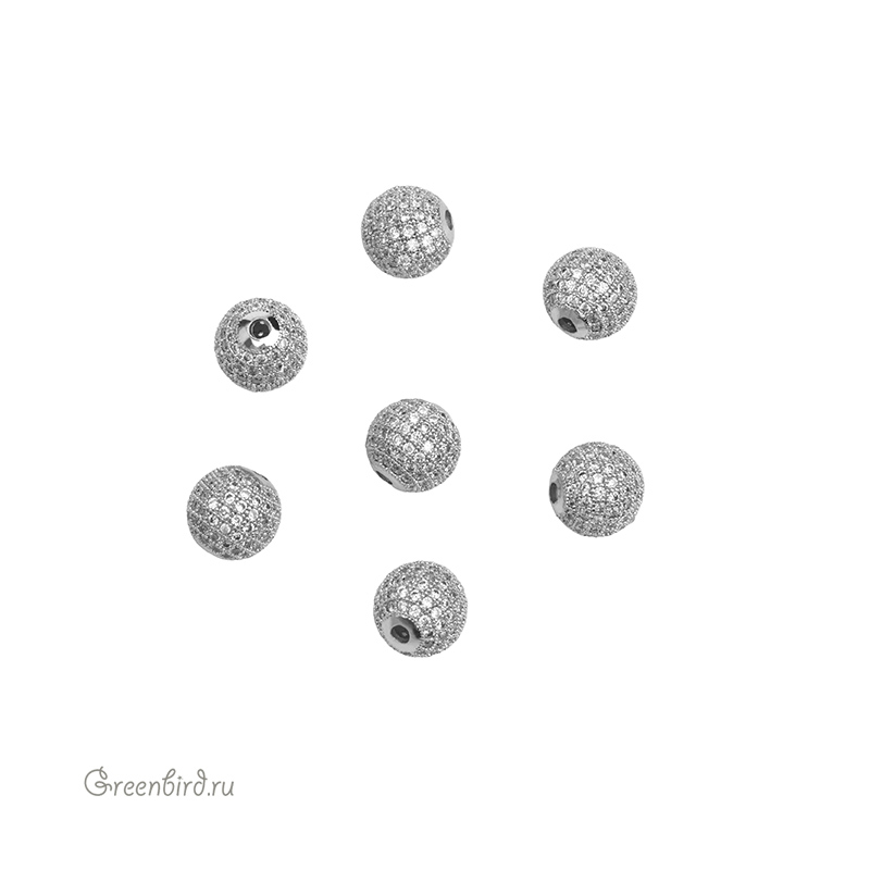 Металлическая бусина в форме шара с фианитами. Материал: латунь, покрытие: родий. Размер: 12 мм, диаметр отверстия: 2.5 мм. Производство: Китай. Цена указана за 1 шт.