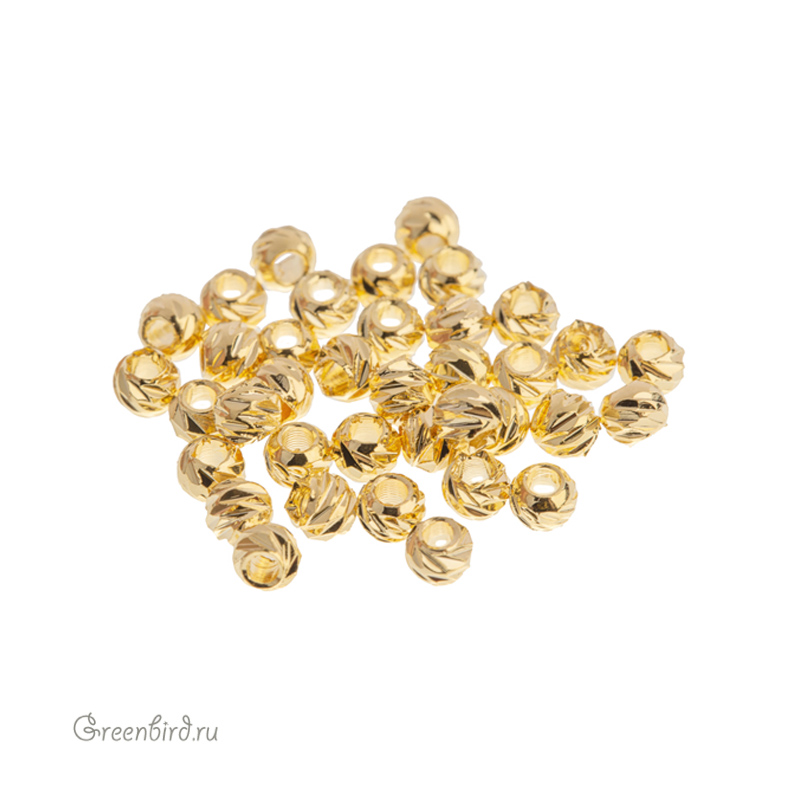 Металлическая бусина с рифленой поверхностью (имитация насечек). Материал: латунь, покрытие: золото. Размер: 3 х 2.4 мм, отверстие: 1 мм. Размеры могут незначительно отличаться. Производство: Китай. Цена указана за 1 шт.