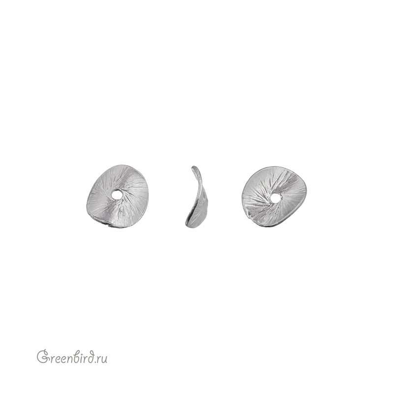 Металлическая бусина с текстурированием, может использоваться в качестве спейсера (разделителя) или чашечки для другой фигурной бусины. Материал: пьютер (оловянный сплав), покрытие: матовый родий. Размер: 9,7 х 8,6 х 2,3 мм, отверстие: 1,3-1,4 мм. Производство: Корея. Цена указана за 1 шт.