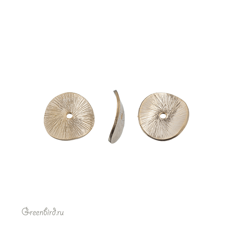 Металлическая бусина с текстурированием, может использоваться в качестве спейсера (разделителя) или чашечки для другой фигурной бусины. Материал: пьютер (оловянный сплав), покрытие: матовое золото. Размер: 15 х 14,8 х 3,1 мм, отверстие: 1,7 мм. Производство: Корея. Цена указана за 1 шт.