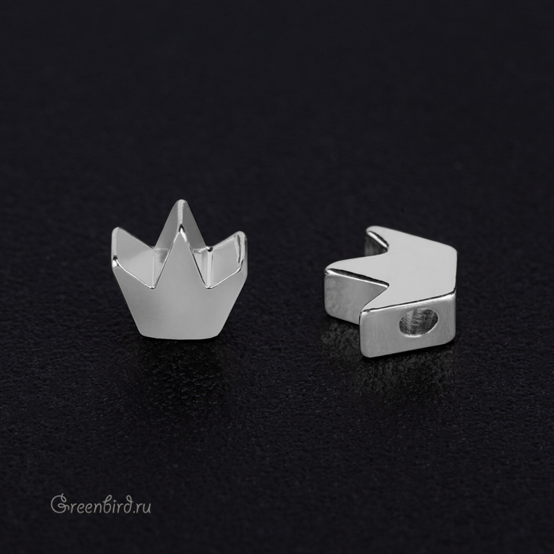 Металлическая бусина в форме силуэта короны. Материал: латунь, покрытие: родий. Размер в узкой части: 3,5 мм, размер в широкой части: 5,4 мм, высота: 5,6 мм, толщина: 2,5 мм, диаметр отверстия: 1,3 мм. Производство: Китай. Цена указана за 1 шт.