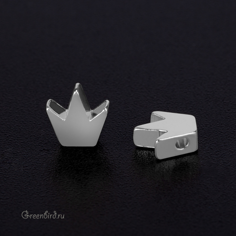 Металлическая бусина в форме силуэта короны. Материал: латунь, покрытие: родий. Размер в узкой части: 4,9 мм, размер в широкой части: 7,8 мм, высота: 8 мм, толщина: 2,9 мм, диаметр отверстия: 1,3 мм. Производство: Китай. Цена указана за 1 шт.