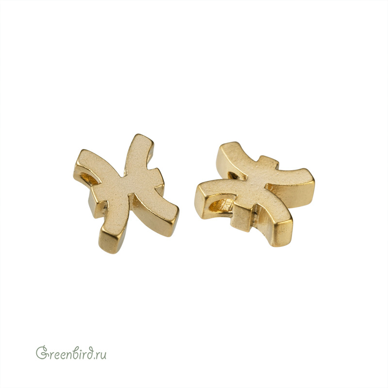 Металлическая бусина в форме зодиакального символа (Рыбы). Материал: латунь, покрытие: матовое золото. Размер: 5,7 х 7,2 мм, толщина: 2,6 мм, отверстие: 1,2 мм. Производство: Корея. Цена указана за 1 шт.