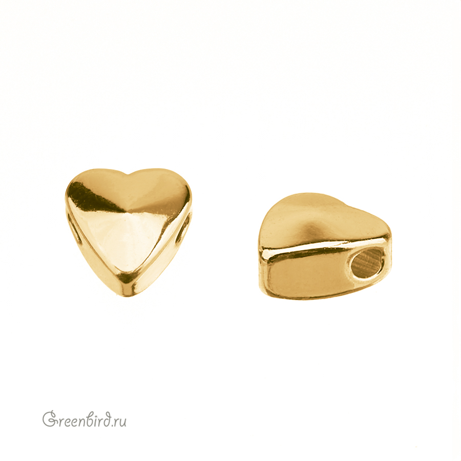 Металлическая бусина гладкая в форме слегка выпуклого сердечка. Материал: латунь, покрытие: золото. Размер: 5,6 х 6 х 3,5 мм, диаметр отверстия примерно 1,3 мм. Размеры могут незначительно отличаться. Производство: Китай. Цена указана за 1 шт.