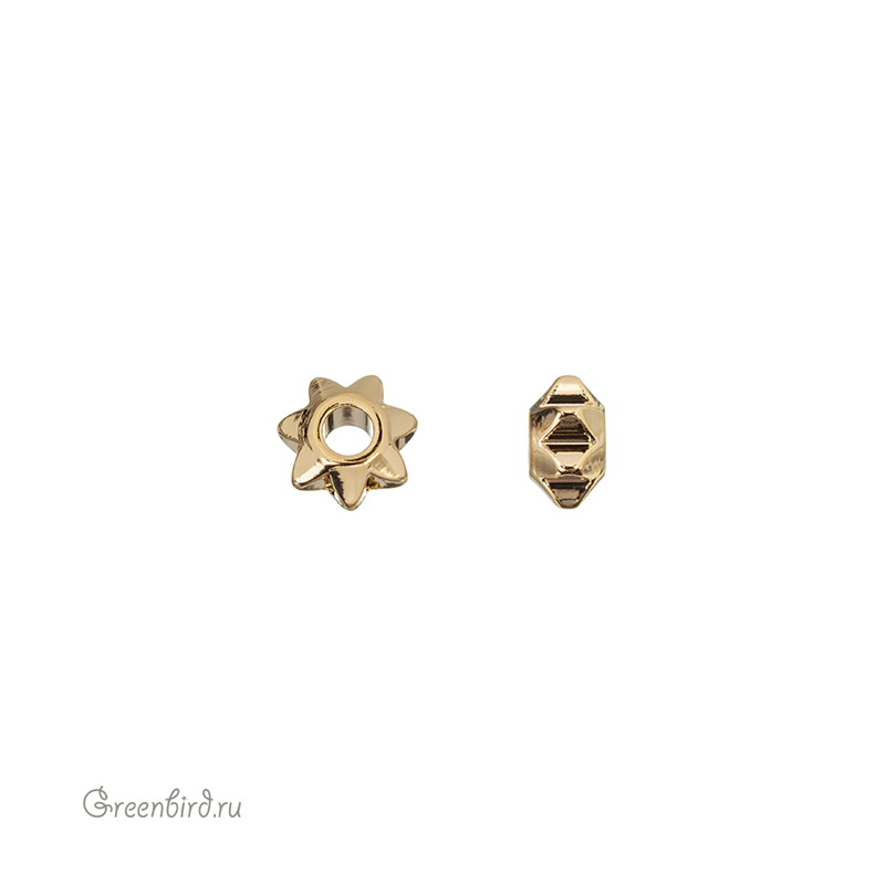 Металлическая бусина-разделитель в форме семиконечной звезды. Материал: латунь, покрытие: светлое золото. Размер: 2,8 х 4,8 мм, диаметр отверстия: 1,7 мм. Производство: Корея. Цена указана за 1 шт.