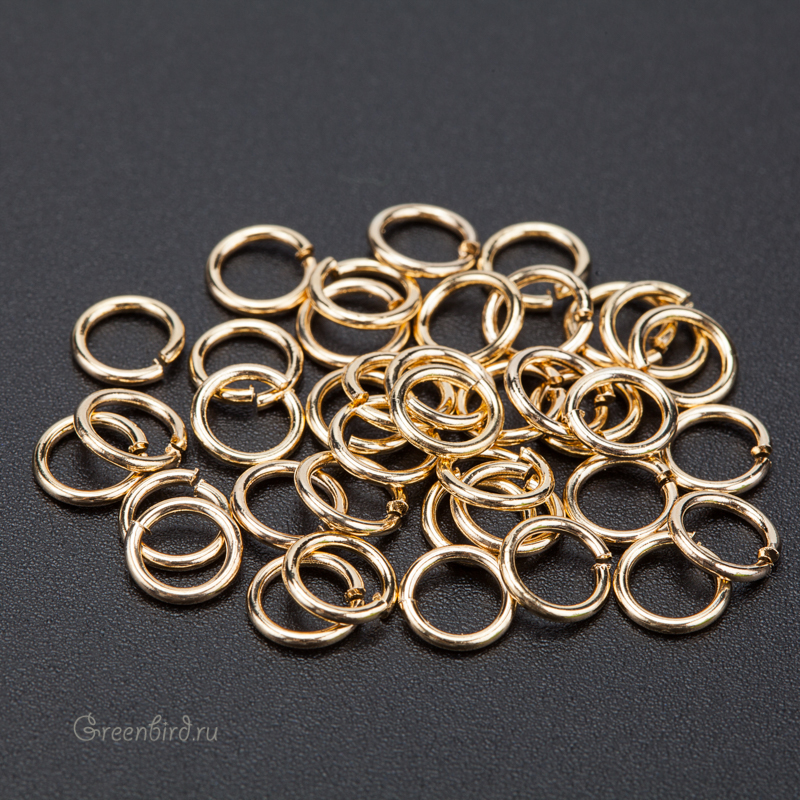 Фурнитура для бижутерии - соединительные кольца. Материал: латунь, покрытие: золото. Диаметр (внешний): 7 мм, толщина проволоки: 1 мм. Производство: Китай. Цена указана за 5 гр (примерно 38 штук).