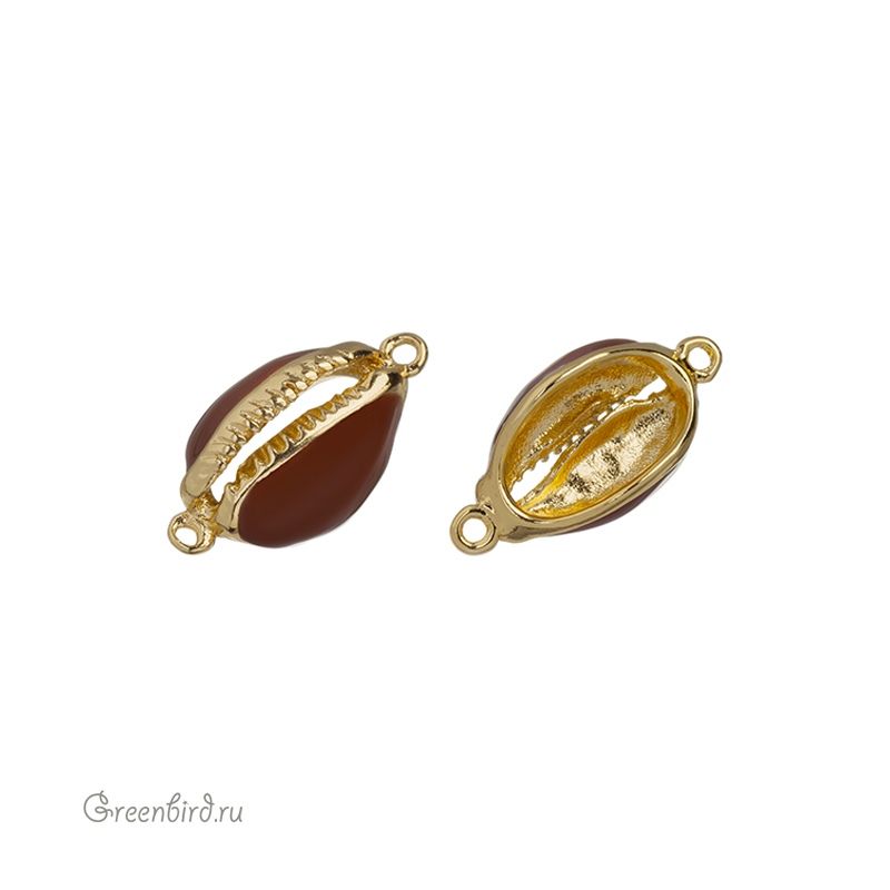 Фурнитура для бижутерии - коннектор односторонний в форме ракушки каури с эмалью. Материал: латунь, покрытие: золото. Цвет эмали: красно-коричневый. Размер: 22,3 х 11,1 х 7,8 мм, внутренний размер примерно 7,3 х 13 мм, колечки: 1,4 мм. Размеры могут незначительно отличаться. Производство: Китай. Цена указана за 1 шт.