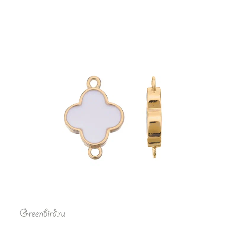 Фурнитура для бижутерии - подвеска-коннектор с эмалью в форме клевера. Материал: латунь, покрытие: золото, цвет: белый. Размер с колечками: 14 х 10 х 2,5 мм, колечки: 1 мм. Производство: Китай. Цена указана за 1 шт.