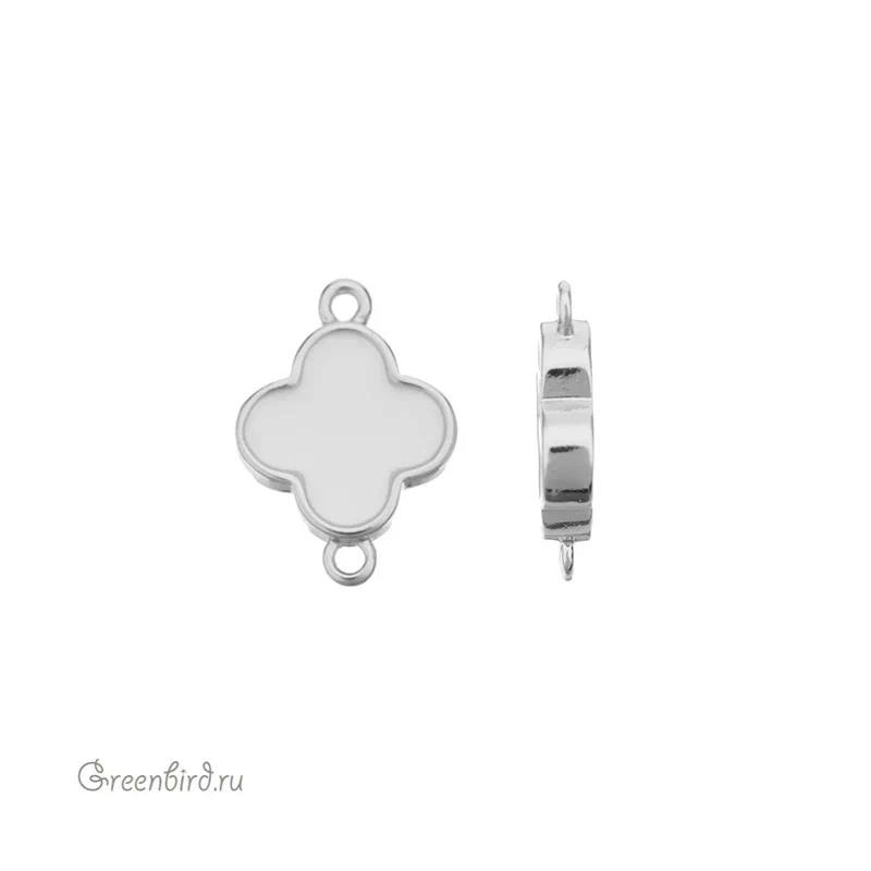 Фурнитура для бижутерии - подвеска-коннектор с эмалью в форме клевера. Материал: латунь, покрытие: родий, цвет: белый. Размер с колечками: 14 х 10 х 2,5 мм, колечки: 1 мм. Производство: Китай. Цена указана за 1 шт.