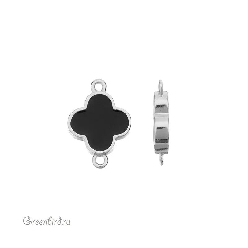 Фурнитура для бижутерии - подвеска-коннектор с эмалью в форме клевера. Материал: латунь, покрытие: родий, цвет: черный. Размер с колечками: 14 х 10 х 2,5 мм, колечки: 1 мм. Производство: Китай. Цена указана за 1 шт.