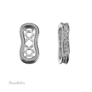 Фурнитура для бижутерии - коннектор-разделитель на две нити, по всему контуру украшенный бесцветными фианитами. В сборке изделия примыкает к бусинам по принципу чашечки. Подходит для бусин диаметром 6 мм. Материал: латунь, покрытие: родий. Размер: 12,6 х 6 мм (5,2 мм в узком месте). Производство: Китай. Цена указана за 1 шт.