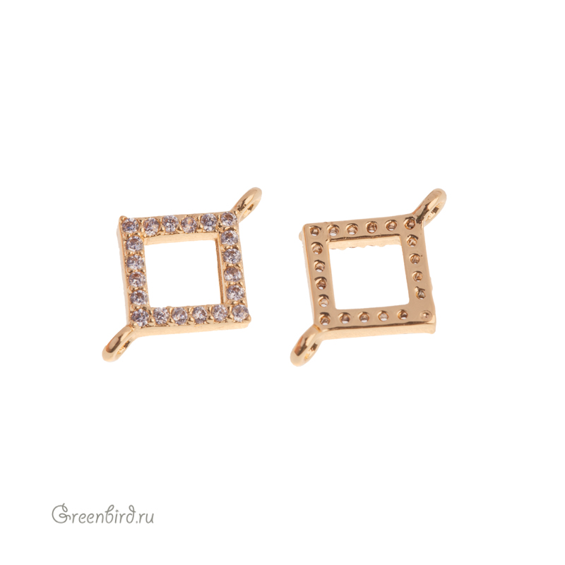 Фурнитура для бижутерии - коннектор в форме равностороннего ромба, с одной стороны украшенный фианитами (кристальное паве). Материал: латунь, покрытие: золото. Размер с колечками: 12,3 х 8,8 мм, внутренний размер отверстия: 5 х 5 мм, колечки: 0,9 мм. Производство: Китай. Цена указана за 1 шт.