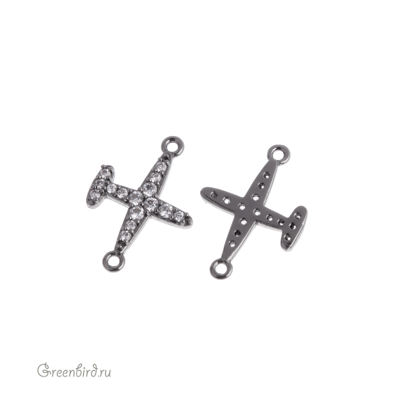 Фурнитура для бижутерии - коннектор в форме самолета, с одной стороны украшенный фианитами (кристальное паве), с фронтально ориентированными колечками. Материал: латунь, покрытие: gunmetal (оружейная сталь). Размер с колечками: 17,6 х 12,1 мм, колечки: 1 мм. Производство: Китай. Цена указана за 1 шт.