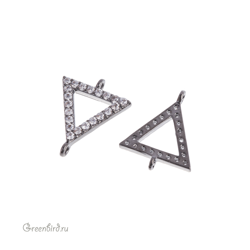 Фурнитура для бижутерии - коннектор в форме треугольника, с одной стороны украшенный фианитами (кристальное паве). Материал: латунь, покрытие: gunmetal (оружейная сталь). Размер с колечками: 13,7 х 11,4 мм, внутренний размер отверстия: 5 х 5,5 мм, колечки: 0,7-0,8 мм и 1 мм. Производство: Китай. Цена указана за 1 шт.
