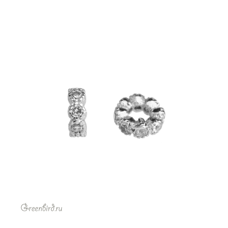 Фурнитура для бижутерии - рондель с фианитами. Материал: латунь, покрытие: родий. Размер: 1,7 х 4,5 мм, внутренний диаметр: 1,9 мм. Производство: Китай. Цена указана за 1 шт.