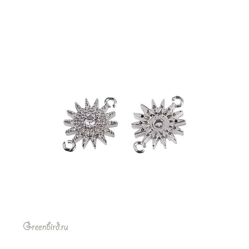 Фурнитура для бижутерии - коннектор с фианитами (кристальным паве) и незапаянными колечками. Материал: латунь, покрытие: родий. Размер: 12,4 х 8,8 мм, колечки: 0,8-0,9 мм. Производство: Корея. Цена указана за 1 штуку.