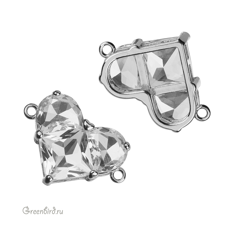 Фурнитура для бижутерии - объемный коннектор в форме сердца, украшенный крупными фианитами. Материал: латунь, покрытие: родий. Цвет вставки: бесцветный. Размер с колечками: 26 х 18 х 7 мм, внутренний размер колечек: 1,6 мм. Производство: Китай. Цена указана за 1 шт.