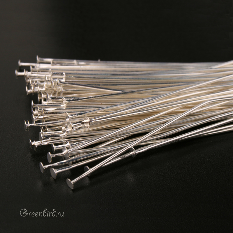 Фурнитура для бижутерии - пины со шляпкой (гвоздики). Цвет: серебро. Длина: 50 мм, толщина: 0,7 мм, шляпка 1,9 мм. Производство: Китай. Цена указана за упаковку (примерно 100 штук).