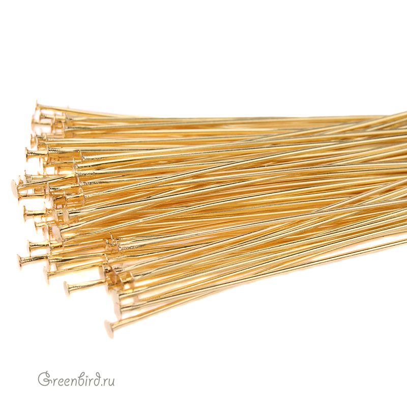 Фурнитура для бижутерии - пины со шляпкой (гвоздики). Цвет: золото. Длина: 50 мм, толщина: 0,7 мм, шляпка 1,9 мм. Производство: Китай. Цена указана за упаковку (примерно 100 штук).