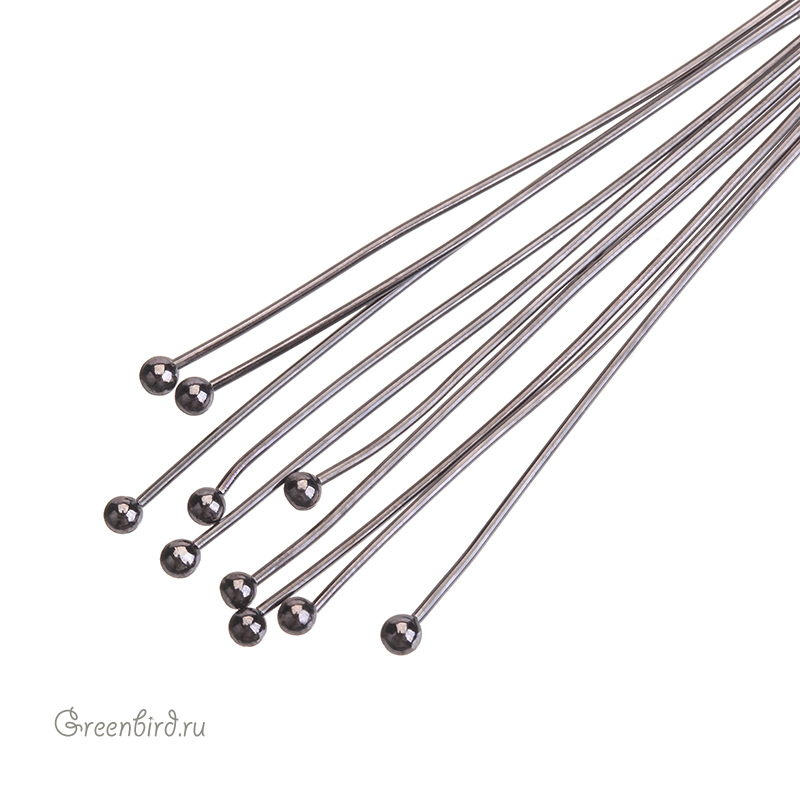Фурнитура для бижутерии - пины с шариком. Материал: латунь, покрытие: gunmetal (оружейная сталь). Длина: 50 мм, толщина: 0,6 мм, диаметр шарика: 2 мм. Производство: Китай. Цена указана за 10 шт.