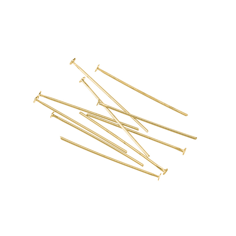 Фурнитура для бижутерии - жесткие пины со шляпкой. Материал: латунь, покрытие: золото. Длина: 24 мм, толщина: 0,6 мм, шляпка: 1,5 мм, производство: Китай. Цена указана за 10 штук.