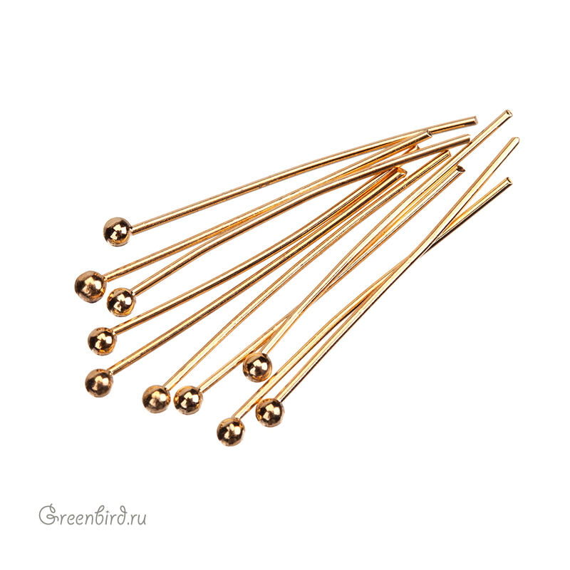 Фурнитура для бижутерии - пины с шариком. Материал: латунь, покрытие: золото. Длина: 20 мм, толщина: 0,5 мм, диаметр шарика: 1.5 мм. Производство: Китай. Цена указана за 10 шт.