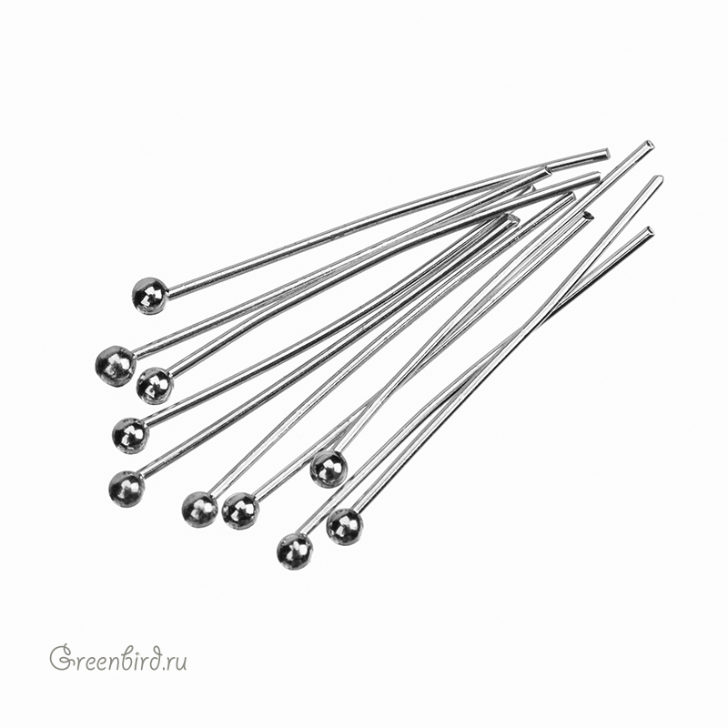 Фурнитура для бижутерии - пины с шариком. Материал: латунь, покрытие: родий. Длина: 20 мм, толщина: 0,5 мм, диаметр шарика: 1.5 мм. Производство: Китай. Цена указана за 10 шт.