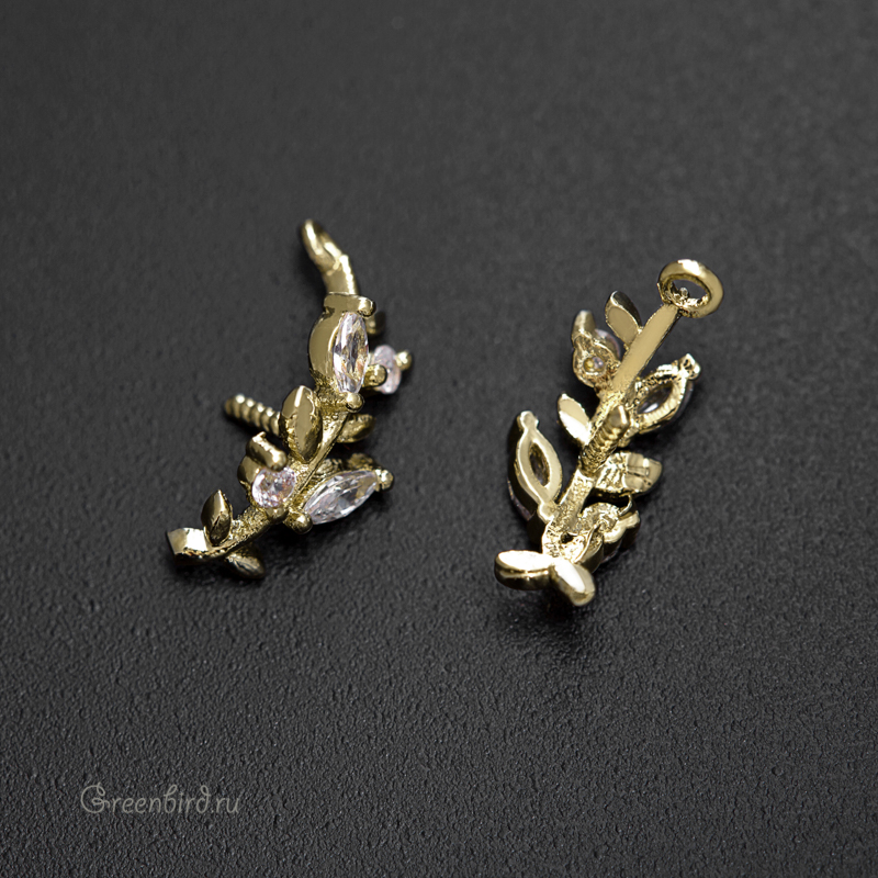 Фурнитура для бижутерии - подвеска в форме веточки, украшенной фианитами, с витым штырьком для вклеивания. Материал: латунь, покрытие: светлое золото. Форма огранки фианитов: маркиз и круглая. Размер декоративного элемента с петелькой: 11,4 х 5,2 мм, длина штырька: 4,3 мм, толщина штырька: 0,8 мм. Производство: Китай. Цена указана за 1 шт.