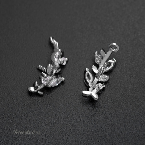 Фурнитура для бижутерии - подвеска в форме веточки, украшенной фианитами, с витым штырьком для вклеивания. Материал: латунь, покрытие: родий. Форма огранки фианитов: маркиз и круглая. Размер декоративного элемента с петелькой: 11,4 х 5,2 мм, длина штырька: 4,3 мм, толщина штырька: 0,8 мм. Производство: Китай. Цена указана за 1 шт.