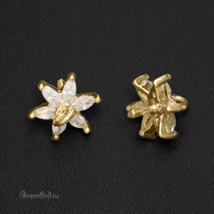 Фурнитура для бижутерии - подвеска-шапочка в форме цветка, украшенного фианитами, с гладким штырьком для вклеивания. Материал: латунь, покрытие: светлое золото. Форма огранки фианитов: маркиз. Размер декоративного элемента с петелькой: 8,1 х 5,3 мм, длина штырька: 3,1 мм, толщина штырька: 1 мм. Производство: Китай. Цена указана за 1 шт.