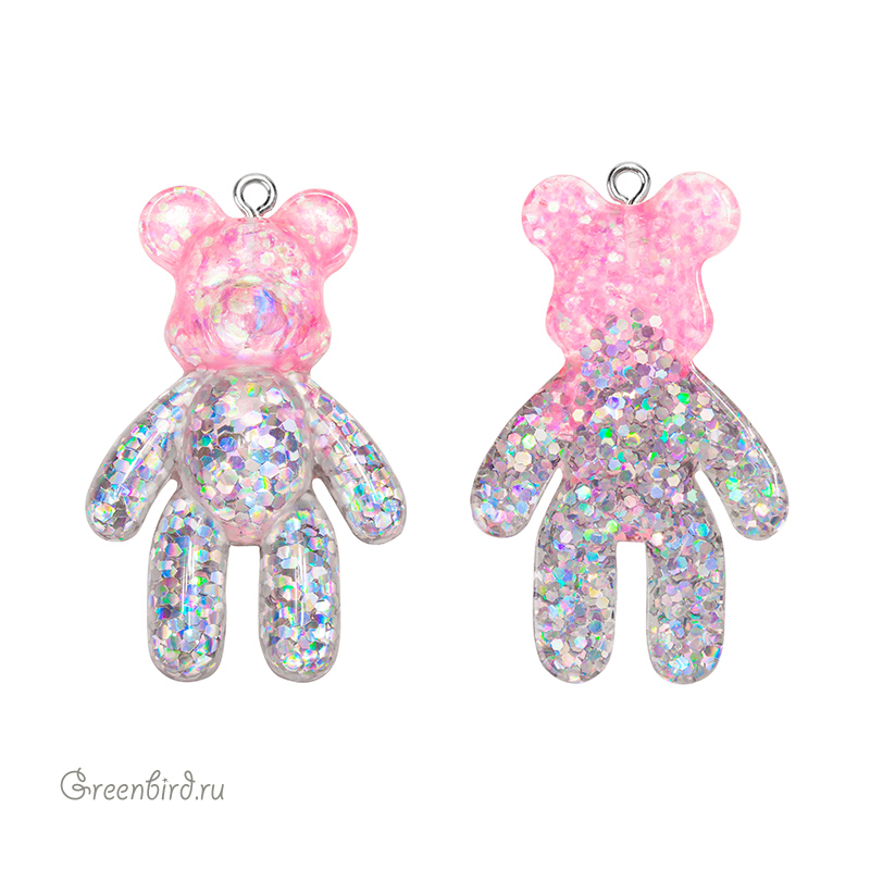 Фурнитура для бижутерии - подвеска в форме мишки. Материал: акрил (пластик), цвет: серебристый и розовый с крупными разноцветными блестками. Материал фурнитуры: латунь, покрытие: родий. Размер с колечком: 45 х 27,5 х 8 мм, внутренний диаметр колечка: 2 мм. Производство: Китай. Цена указана за 1 шт.