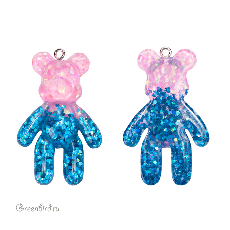 Фурнитура для бижутерии - подвеска в форме мишки. Материал: акрил (пластик), цвет: синий и розовый с крупными разноцветными блестками. Материал фурнитуры: латунь, покрытие: родий. Размер с колечком: 45 х 27,5 х 8 мм, внутренний диаметр колечка: 2 мм. Производство: Китай. Цена указана за 1 шт.