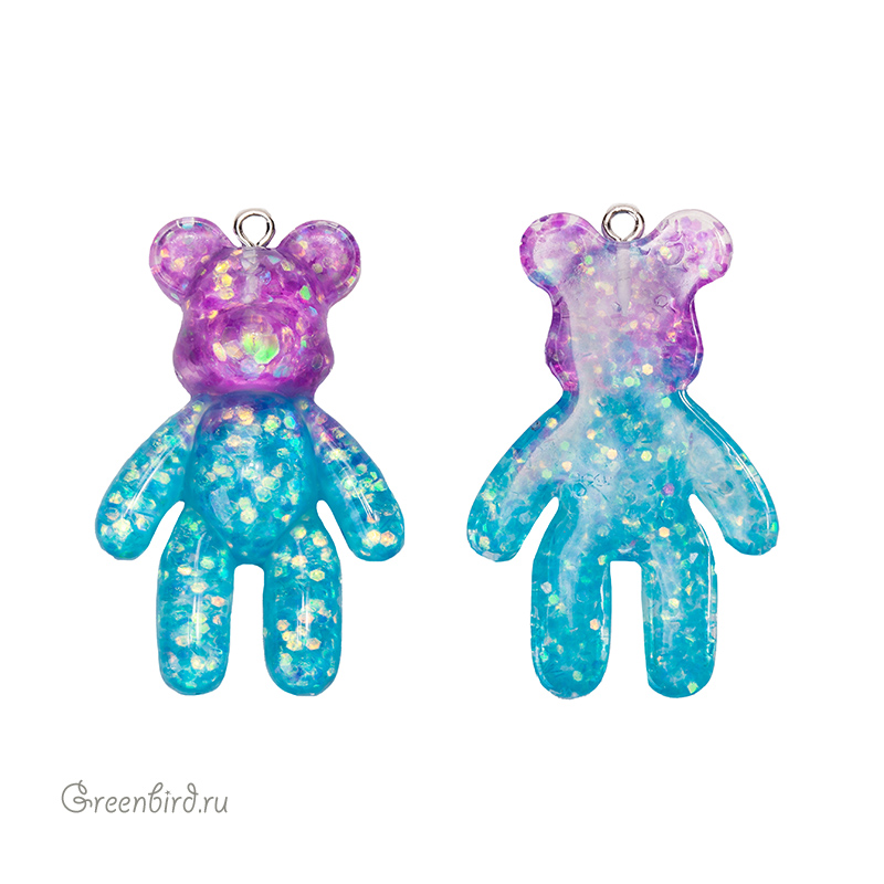 Фурнитура для бижутерии - подвеска в форме мишки. Материал: акрил (пластик), цвет: голубой и фиолетовый с крупными разноцветными блестками. Материал фурнитуры: латунь, покрытие: родий. Размер с колечком: 45 х 27,5 х 8 мм, внутренний диаметр колечка: 2 мм. Производство: Китай. Цена указана за 1 шт.
