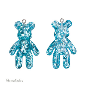 Фурнитура для бижутерии - подвеска в форме мишки. Материал: акрил (пластик), цвет: ярко-голубой с крупными блестками. Материал фурнитуры: латунь, покрытие: родий. Размер с колечком: 45 х 27,5 х 8 мм, внутренний диаметр колечка: 2 мм. Производство: Китай. Цена указана за 1 шт.