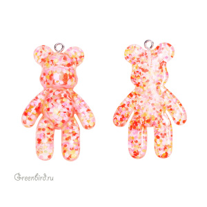 Фурнитура для бижутерии - подвеска в форме мишки. Материал: акрил (пластик), цвет: красный с крупными разноцветными блестками. Материал фурнитуры: латунь, покрытие: родий. Размер с колечком: 45 х 27,5 х 8 мм, внутренний диаметр колечка: 2 мм. Производство: Китай. Цена указана за 1 шт.