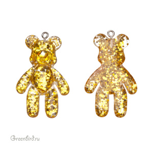 Фурнитура для бижутерии - подвеска в форме мишки. Материал: акрил (пластик), цвет: золотистый с крупными блестками. Материал фурнитуры: латунь, покрытие: родий. Размер с колечком: 45 х 27,5 х 8 мм, внутренний диаметр колечка: 2 мм. Производство: Китай. Цена указана за 1 шт.