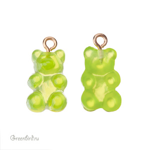 Фурнитура для бижутерии - подвеска в форме мармеладного мишки. Материал: пластик, цвет: зеленый, материал: латунь, покрытие фурнитуры: золото. Размер с колечком: 20,7 х 11 х 7 мм, внутренний диаметр колечка: 1,8 мм. Производство: Китай. Цена указана за 1 шт.