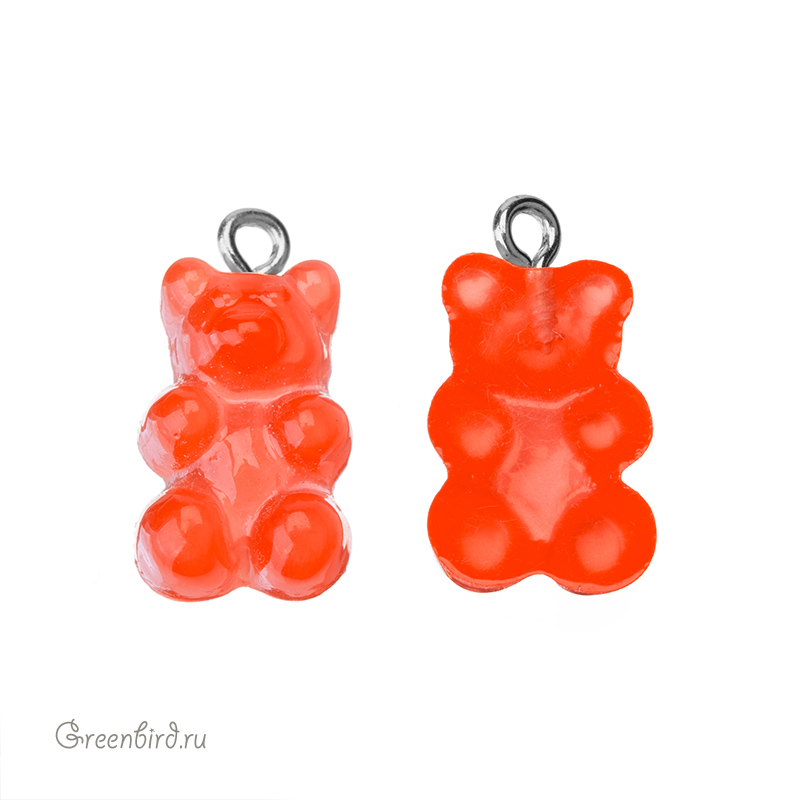 Фурнитура для бижутерии - подвеска в форме мармеладного мишки. Материал: пластик, цвет: красный, материал: латунь, покрытие фурнитуры: родий. Размер с колечком: 20,7 х 11 х 7 мм, внутренний диаметр колечка: 1,8 мм. Производство: Китай. Цена указана за 1 шт.