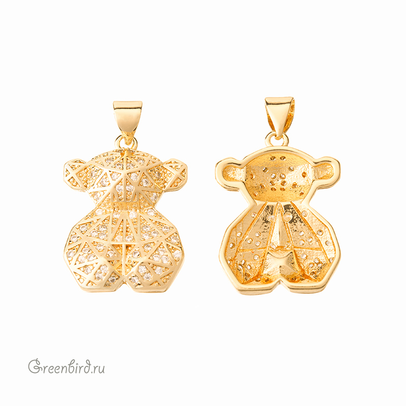 Фурнитура для бижутерии - подвеска с фианитами в форме мишки с колечком и бейлом. Материал: латунь, покрытие: золото. Размер с колечком и бейлом: 27 х 17 х 5 мм, внутренний диаметр колечка: 1,4 мм, размер бейла: 6 х 4 мм. Производство: Китай. Цена указана за 1 шт.