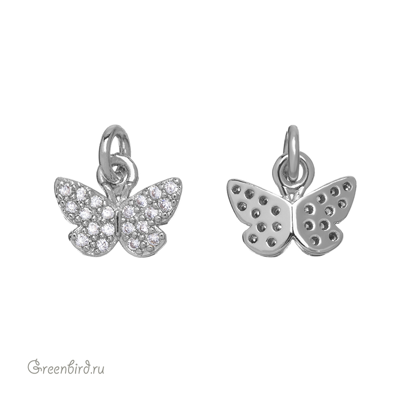 Фурнитура для бижутерии - объемная подвеска в форме бабочки, украшенная фианитами. Материал: латунь, покрытие: родий. Размер с колечком: 10 х 9 мм, внутренний диаметр колечка: 2,5 мм. Производство: Китай. Цена указана за 1 шт.