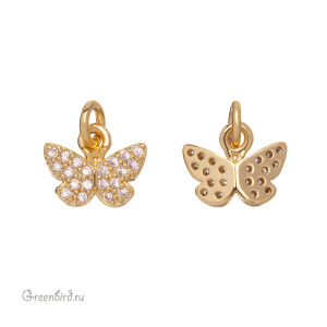 Фурнитура для бижутерии - объемная подвеска в форме бабочки, украшенная фианитами. Материал: латунь, покрытие: золото. Размер с колечком: 10 х 9 мм, внутренний диаметр колечка: 2,5 мм. Производство: Китай. Цена указана за 1 шт.