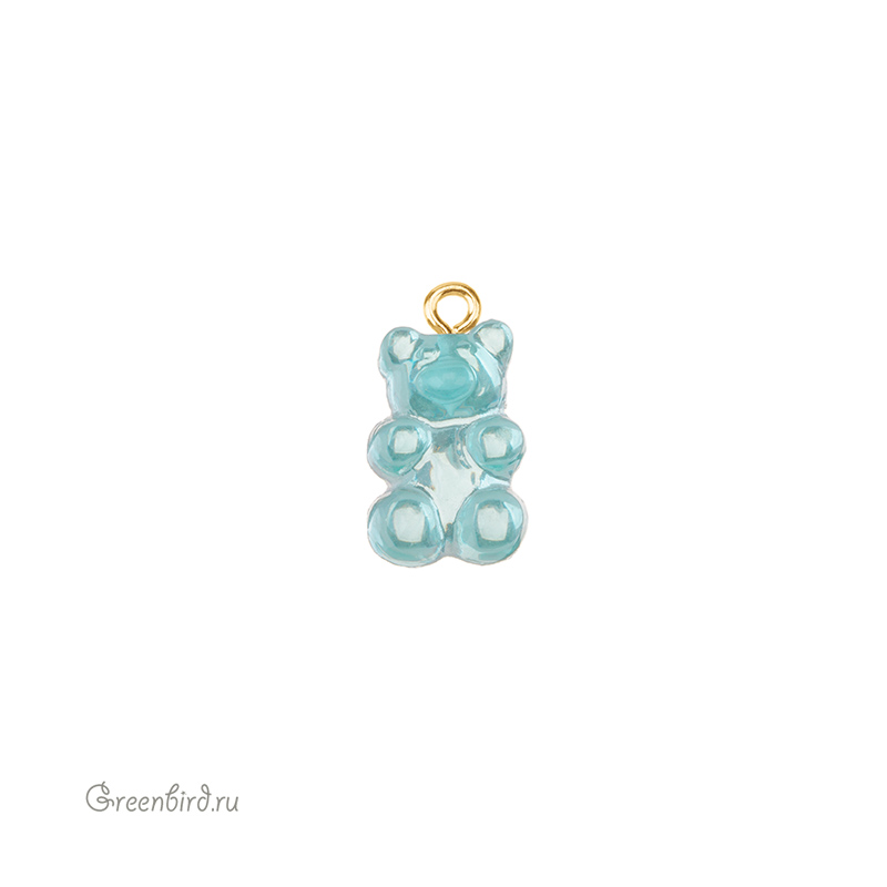 Фурнитура для бижутерии - подвеска в форме мармеладного мишки. Материал: пластик, цвет: прозрачный, бирюзовый; материал колечка: латунь, покрытие фурнитуры: золото. Размер с колечком: 20 х 11 х 6,5 мм, внутренний диаметр колечка: 1,8 мм. Производство: Китай. Цена указана за 1 шт.
