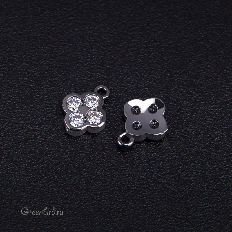 Фурнитура для бижутерии - подвеска в форме четырехлистника, украшенная фианитами. Материал: латунь, покрытие: gunmetal (оружейная сталь), темный. Размер с колечком: 6,2 х 8,1 мм, внутренний диаметр колечка: 0,8 мм. Производство: Китай. Цена указана за 1 шт.