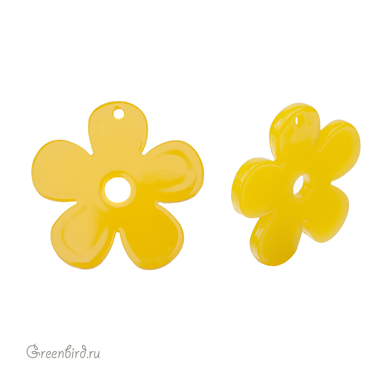Элемент для бижутерии - подвеска в форме цветка. Материал: пластик, цвет: желтый. Размер: 29 мм, толщина: 2,5 мм, диаметр отверстия: 1,6 мм. Производство: Китай. Цена указана за 1 шт.