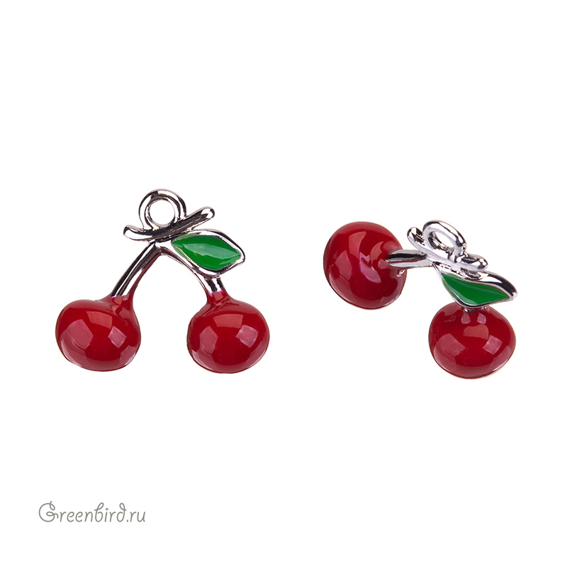 Фурнитура для бижутерии - подвеска в форме вишни с эмалью. Материал: латунь, покрытие: родий. Цвет: красный, зеленый. Размер с колечком: 10,5 х 12 х 5 мм, внутренний размер колечка: 1,2 мм. Производство: Китай. Цена указана за 1 шт.