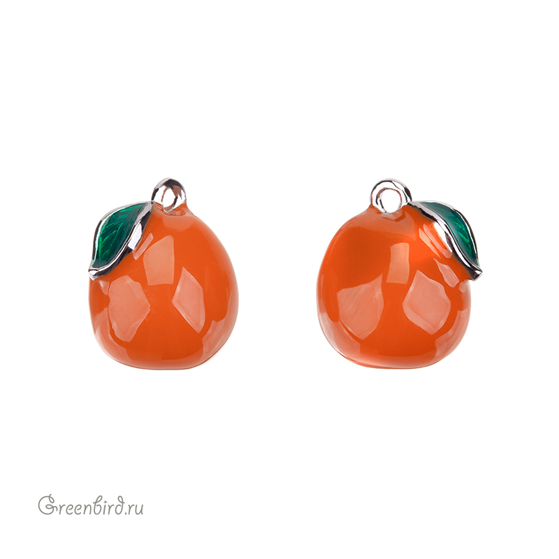 Фурнитура для бижутерии - подвеска в форме апельсина с эмалью. Материал: латунь, покрытие: родий. Цвет: оранжевый, зеленый. Размер с колечком: 12,3 х 10 мм, внутренний размер колечка: 1,4 мм. Производство: Китай. Цена указана за 1 шт.