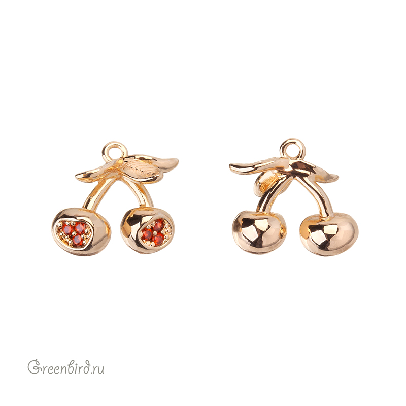 Фурнитура для бижутерии - подвеска в форме вишен, украшенная фианитами. Материал: латунь, покрытие: золото. Размер с колечком: 10,4 х 10,8 мм, внутренний диаметр колечка: 0,9 мм. Производство: Китай. Цена указана за 1 шт.