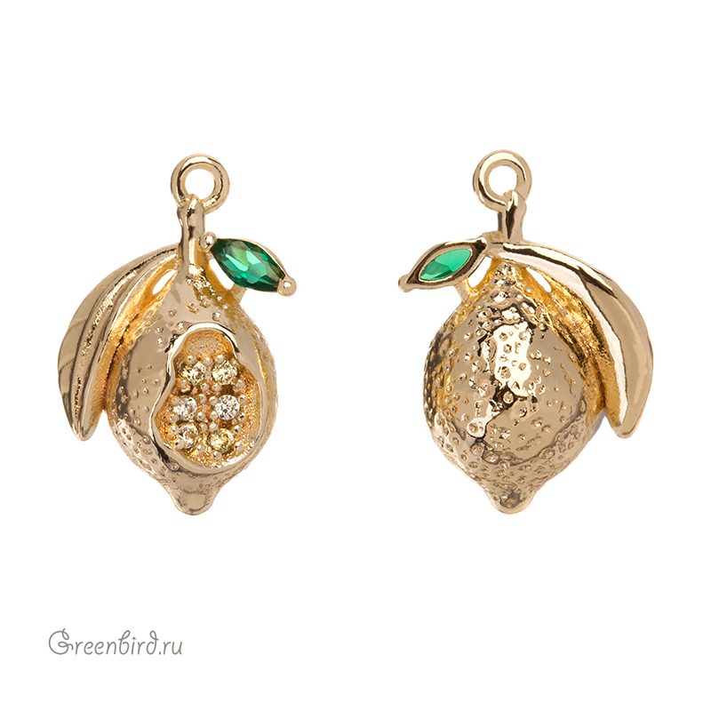Фурнитура для бижутерии - объемная подвеска в форме лимона, украшенная фианитами. Материал: латунь, покрытие: золото. Размер с колечком: 16 х 10,5 мм, внутренний диаметр колечка: 0,9 мм. Производство: Китай. Цена указана за 1 шт.
