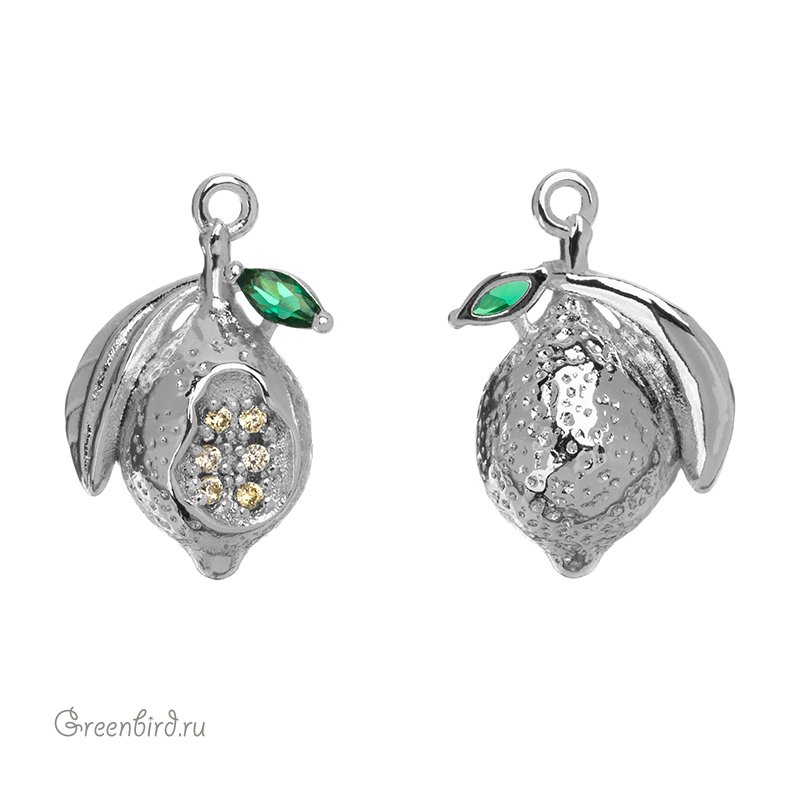 Фурнитура для бижутерии - объемная подвеска в форме лимона, украшенная фианитами. Материал: латунь, покрытие: родий. Размер с колечком: 16 х 10,5 мм, внутренний диаметр колечка: 0,9 мм. Производство: Китай. Цена указана за 1 шт.