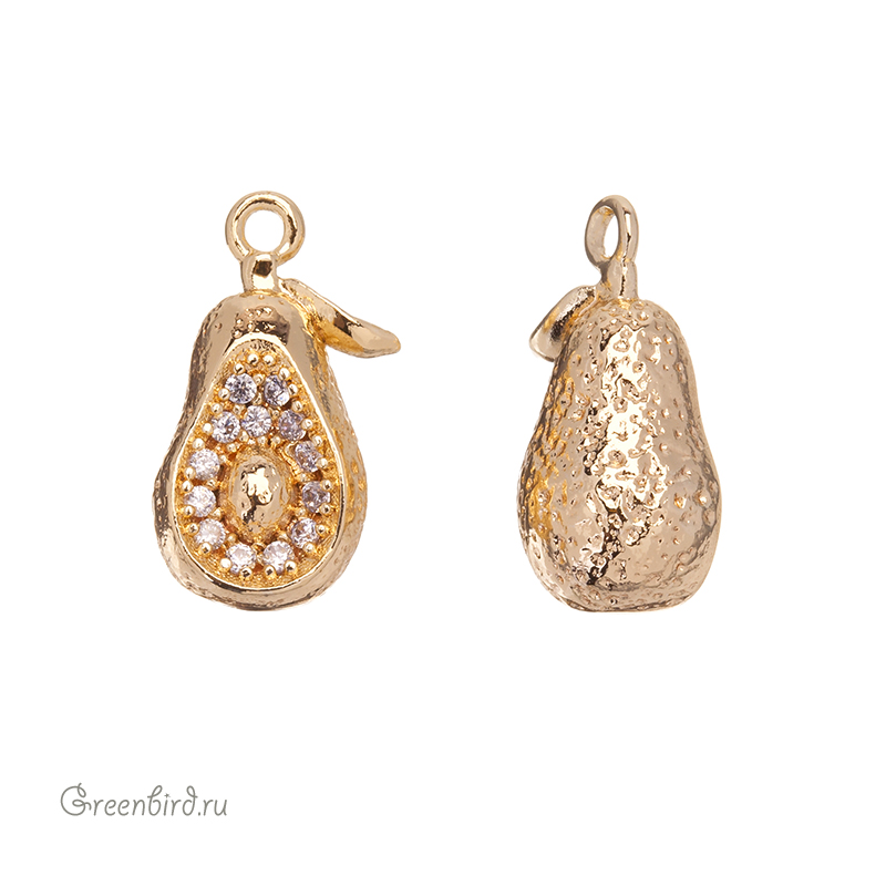 Фурнитура для бижутерии - объемная подвеска в форме груши, украшенная фианитами. Материал: латунь, покрытие: золото. Размер с колечком: 16 х 8,3 мм, внутренний диаметр колечка: 1,4 мм. Производство: Китай. Цена указана за 1 шт.